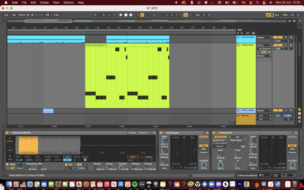 • I started off by wanting to create a cyberpunk/dystopian soundscape that incorporated a variety of field recording to create a psychoacoustic effect to transport the listener elsewhere. I started off by jamming out in the synth room to gather samples for me to chop up later. After I had got some analog synth sounds I was trying to make a more deconstructed piece of work compared to what I usually make. After making a couple of field recordings I tried to make a piece incorporating various techniques I decided to make more of a song that reflects the current virtual Neo liberal prison that we have arrived at. I want to combine analog instruments/ guitars and combine it with futuristic synths to creat a retro-futuristic and almost nostalgic piece that harks to a more 90’s depiction of the future. My process was starting off with a synth that chopped up and then programmed drums to accompany the synth, after that I played a riff on my guitar and chopped it up and bit crushed it. After that I was chopping up an amen break to reflect on my research on Memetics and how chopping up breaks is mutation that “meme”.  For the chorus I created my own bass using Ableton wavetable.  After I has structured the whole song I wrote lyrics about being sucked into a vortex of content and information, “virtual vortex”. Once I had everything recorded I cleaned all the Chanel up with EQ and compression and added a little saturation for crunch. Once everything was mixed a ran the bounce through my mastering rack which consists of a limiter and a couple of EQs.